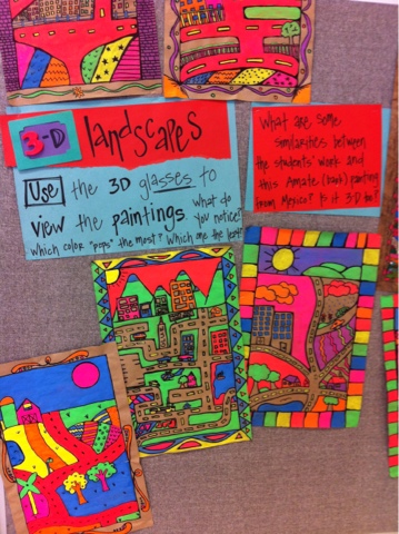 Today, we wrapped up the last bits of painting and outlining on our Amate bark painting. Using simple color theory of cool colors receding and warm colors advancing we were able to achieve a 3D effect with our "prism" glasses. Too bad the 3D effect doesn't work online!